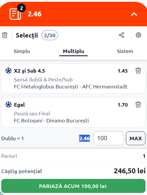 ► Metaloglobus București - FC Hermannstadt : X2 & sub 4,5 goluri, cota