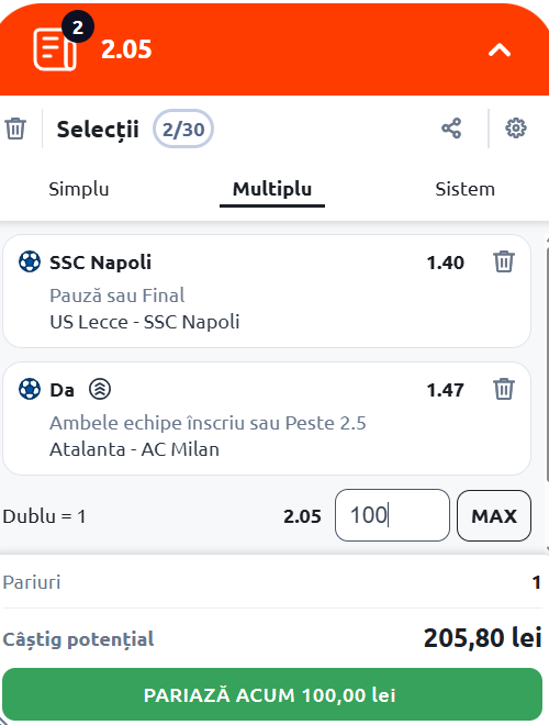 Expertul Legalbet vă recomandă Cota 2 de marți, 28 octombrie 2025, care vine cu meciurile US Lecce - SSC Napoli şi Atalanta - AC Milan.