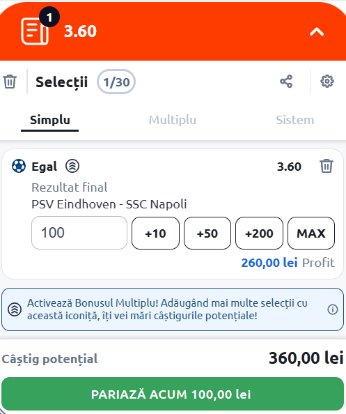 Expertul Legalbet, vă recomandă Biletul zilei de marți, 21 octombrie 2025, care vine cu meciul PSV Eindhoven - SSC Napoli.
